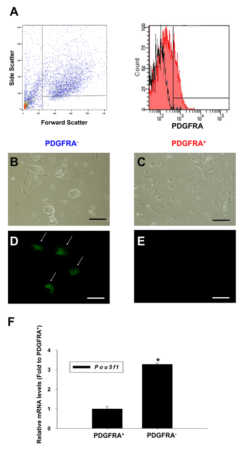 Figure 1: Characterization of PDGFRA+ and PDGFRA- sorted cell population. A. Flow cytometric analysis of the PDGFRA expression in differentiating mGSCs. B.-E. Images on day 2 after plating of mGSC-derived PDGFRA+ and PDGFRA− cells. B., D. PDGFRA- sorted cells C., E. PDGFRA+ sorted cells. B., C. phase contrast, and D., E. fluorescent imaging showing POU5F1 expression. F. Quantification of Pou5f1 gene expressions. The Pou5f1 gene expression levels normalized to that of PDGFRA+ cells (mean ± SEM; n = 3). Means with different letters are significantly different (P < 0.05). B-E: Scale bar = 100 μm.