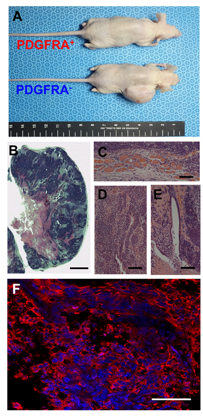 Figure 2: Teratoma assay of PDGFRA+ and PDGFRA- cells. A. Teratoma from PDGFRA- cells in nude mice. Presence of all three primary germ-layer derivatives in a teratoma (B. image of H&E stained teratoma, C. Muscle; mesoderm, D. Neural tissue; ectoderm, E. Endothelium; endoderm). F. Fluorescence microscopy image of a teratoma immunostained for KI67. (B. Scale bar = 2.5 mm, C.-E. Scale bar = 100 μm, F. Scale bar = 50 μm)