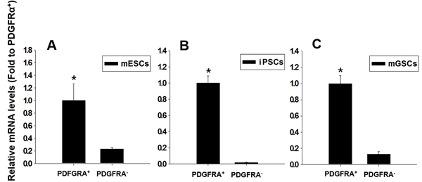 Figure 3: Relative expressions of cardiac-specific gene, cTnT, in PDGFRA+ and PDGFRA- cell populations. A. mESCs, B. iPSCs, C. mGSCs. qRT-PCR analysis of FACS sorted PDGFRA+ cells for the cardiac-specific marker gene, cTnT. The expression levels are normalized to those of PDGFRA + (mean ± SEM; n = 3). Means with different letters are significantly different (P < 0.05).