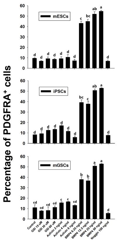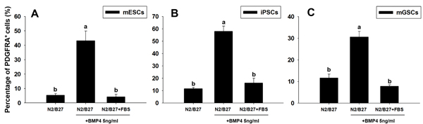 Figure 4: Changes in PDGFRA population in PSCs following BMP4 and FBS-induced differentiation. The percentage of PDGFRA+ cells was evaluated in A. mESCs, B. iPSCs, and C. mGSCs, following exposure to N2/B27 medium supplemented with BMP4 (5 ng/ml) or FBS (15% final concentration). Means with different letters are significantly different (P < 0.05).