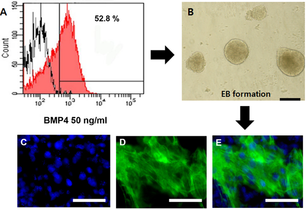 Figure 7: Expression of cTnT in PDGFRA+ derived cardiomyocytes. A. Expression of PDGFRA in mGSC-derived EBs. B. PDGFRA+ cells were sorted by flow cytometry and the generated EBs at day 2, the EBs were re-plated on 0.1% gelatin-coated coverslip for additional 4 days. C.-E. The expression of functional cardiomyocyte marker protein, cTnT, was detected by immunocytochemistry. (Scale bar = 100 μm).