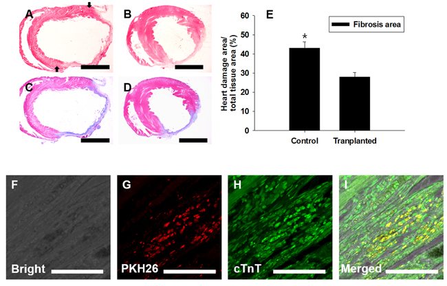 Figure 8: Transplantation of PDGFRA+ population in a rat MI model. FACS-sorted PDGFRA+ cells were transplanted into MI-induced rat hearts. Four weeks after transplantation, Mason-trichrome (MT) staining and immunocytochemical staining for cardiomyocyte marker, cTnT, were performed to assess the functional activity of transplanted PDGFRA+ cells. A., C. PBS-injected control, B., D. MI heart injected with PDGFRA+ cells derived from mGSC culture, A., B. H&E staining, C., D. MT staining to detect the heart with fibrosis. E. Quantification of fibrotic area (mean ± SEM; n = 3), F.-I. Immunocytochemical analysis with cTnT, F. Bright field, G. red fluorescence in PKH26-labeled cells, H. PDGFRA derived cells, I. Merged images of F., G., H. (Scale bar in A-D = 5 mm; F-I = 100 µm).
