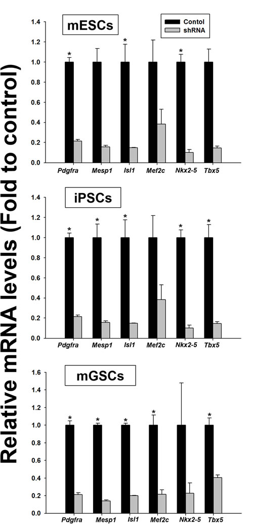 To further investigate the in vitro dependency of mGSCs on Pdgfra signaling for cardiac differentiation, we used shRNA to knockdown Pdgfra expression (shPdgfra). Parallel control experiments used mESCs and iPSCs. Stable shRNA-mediated Pdgfra knockdown was confirmed by qRT-PCR (Figure 5). After 5 days in the EB-inducing culture medium, either empty vector control or shPdgfra cell populations were evaluated for the expression levels of cardiac lineage-specific markers (i.e. Mesp1, Isl1, Mef2c, Nkx2-5, and Tbx5; Figure 5). Results show that following Pdgfra knockdown, there is a substantial reduction of the cardiac lineage-specific gene expression levels in EBs derived from mESC, iPSC, and mGSC cell types. These findings suggest that activated Pdgfra signaling is necessary for the expression of cardiac-related gene expression during cardiac differentiation.