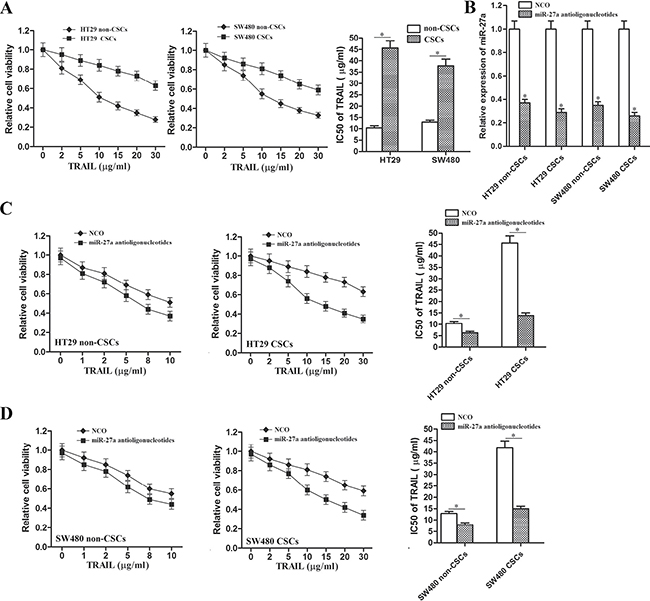 Figure 2: MiR-27a antioligonucleotides sensitized colorectal CSCs to TRAIL. (A) CCK-8 assays were performed to evaluate the sensitivity of HT29 and SW480 CSCs and non-CSCs to TRAIL. *P < 0.05. (B) After transfection with miR-27a antioligonucleotides, relative expression of miR-27a in HT29 non-CSCs, HT29 CSCs, SW480 non-CSCs and SW480 CSCs was detected by qRT-PCR analysis. *P < 0.05 vs. NCO group. (C) CCK-8 assays were performed to evaluate the effect of miR-27a antioligonucleotides on TRAIL-induced cell death in HT29 CSCs and non-CSCs. *P < 0.05. (D) CCK-8 assays were performed to evaluate the effect of miR-27a antioligonucleotides on TRAIL-induced cell death in SW480 CSCs and non-CSCs. *P < 0.05.