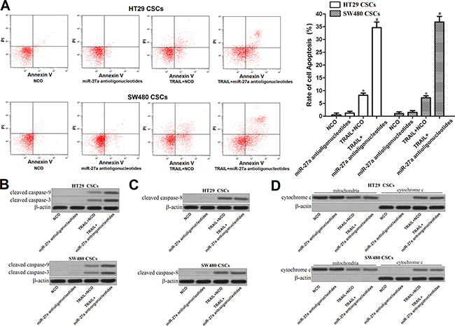 Figure 3: Effect of miR-27a antioligonucleotides and TRAIL on the activation of caspases and apoptosis in colorectal CSCs. (A) HT29 and SW480 CSCs were treated with miR-27a antioligonucleotides and TRAIL (10 mg/ml). Cell apoptosis was measured by flow cytometry analysis. *P < 0.05 vs. NCO group, #P < 0.05 vs. TRAIL + NCO group. (B) HT29 and SW480 CSCs were treated with miR-27a antioligonucleotides and TRAIL (10 mg/ml). Western blot analysis was performed to evaluate the activation of caspase-9 and caspase-3. (C) Cleavage of caspase-8 in HT29 and SW480 CSCs was detected by western blot assays. (D) After separation of mitochondria, cytochrome c in mitochondria and cytoplasm was detected by western blot analysis.