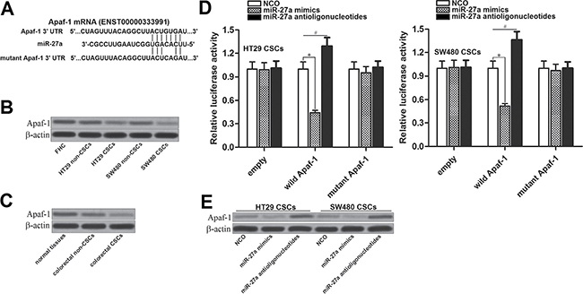 Figure 4: MiR-27a antioligonucleotides increase the expression of Apaf-1 in colorectal CSCs. (A) Apaf-1 mRNA 3′ UTR contained conservative sequence at the miR-27a binding site predicted by the TargetScan database. (B) Expression of Apaf-1 in FHC, HT29 and SW480 CSCs and non-CSCs. (C) Colorectal patients’ tumor and adjacent normal tissues were digested by using collagenase type III to obtain the single cell suspension. After sorting, expression of Apaf-1 in normal colorectal tissue cells, colorectal CSCs and non-CSCs was evaluated by western blot analysis. (D) Luciferase reporter assay in HT29 and SW480 CSCs. The wild or mutant type of Apaf-1 3′ UTR was cloned into pMIR-REPORT plasmid and co-transfected with miR-27a mimics or antioligonucleotides. Dual-Luciferase Reporter Assay System was used to detect the luciferase activities. *P < 0.05. #P < 0.05. (E) Effect of miR-27a mimics and antioligonucleotides on changing the expression of Apaf-1 in HT29 CSCs and non-CSCs.