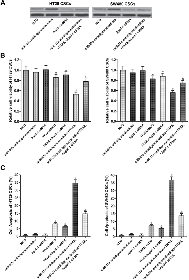 Figure 5: MiR-27a antioligonucleotides sensitized colorectal CSCs to TRAIL by increasing the expression of Apaf-1. (A) Effect of miR-27a antioligonucleotides and Apaf-1 siRNA on changing the expression of Apaf-1 was evaluated by western blot analysis. (B) HT29 and SW480 CSCs were treated with NCO, miR-27a antioligonucleotides, Apaf-1 siRNA and TRAIL (10 mg/ml). Cell viability was measured by using CCK-8 assays. *P < 0.05 vs. NCO group, #P < 0.05 vs. TRAIL + NCO group, &P < 0.05 vs. miR-27a antioligonucleotides + TRAIL group. (C) HT29 and SW480 CSCs were treated with NCO, miR-27a antioligonucleotides, Apaf-1 siRNA and TRAIL (10 mg/ml). Cell apoptosis was measured by flow cytometry. *P < 0.05 vs. NCO group, #P < 0.05 vs. TRAIL + NCO group, &P < 0.05 vs. miR-27a antioligonucleotides + TRAIL group.