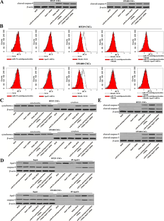 Figure 6: MiR-27a antioligonucleotides promote the formation of Apaf-1-caspase-9 complex in TRAIL-treated colorectal CSCs. (A) After treatment with miR-27a antioligonucleotides, Apaf-1 siRNA and TRAIL, cleavage of caspase-8 was evaluated by western blot analysis in HT29 and SW480 CSCs. (B) Mitochondrial membrane potential (∆Ψm) was detected by using JC-1 on flow cytometry. (C) After separation of mitochondria, cytochrome c in mitochondria and cytoplasm was detected by western blot analysis. (D) Co-immunoprecipitation and western blot analysis was performed to evaluate the formation of Apaf-1-caspase-9 complex. (E) Cleavage of caspase-9 and caspase-3 in HT29 and SW480 CSCs was evaluated by western blot analysis.