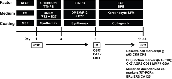 Figure 1: Experimental design used to induce the differentiation of human iPSCs into reserve cell-like cells (iRCs). The protocol consists primarily of two parts: the former is the induction of the IM, and the latter is the induction of epidermal cell-like cells from the IM by culturing the cells on collagen IV. bFGF, fibroblast growth factor-2; EGF, epidermal growth factor; BPE, bovine pituitary extract; MEF, mouse embryonic fibroblast; iPSC, induced pluripotent stem cell; IM, intermediate mesoderm; IF, immunofluorescence; SC junction, squamocolumnar junction.