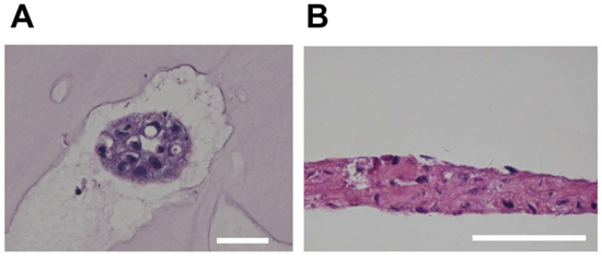Figure 4: H&E staining of iRCs in three-dimensional cultures. (A) Representative image of iRCs in the 3D-embedded culture. The iRCs formed glandular epithelial cell-like cells within two to three days. Note that they formed an inner cavity, unlike the spheroids from cancer cells. The scale bars represent 50 μm. (B) Representative image of iRCs in an air-liquid interface culture after one to three weeks. The iRCs were pseudostratified rather than properly stratified. The scale bars represent 50 μm.