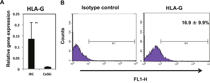 Figure 6: HLA-G expression in iRCs. (A) The expression level of HLA-G mRNA in iRCs and CaSki cells (cervical cancer cells). The iRCs expressed significantly higher levels of HLA-G mRNA than the CaSki cells. (B) Results of the flow cytometric analysis for HLA-G-positive cells in iRCs on day 14 after differentiation. The data are presented as the means ± S.Ds. of three independent experiments. **, p < 0.01. HLA-G, human leukocyte antigen-G.