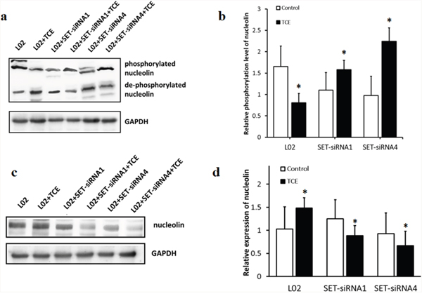 Figure 1: SET decreases phosphorylation of nucleolin and increases its expression in TCE-exposed liver cells. L-02 cells were interfered with two different SET-siRNA oligonucleotides. (a) phosphorylated and unphosphorylated nucleolin were separated by SDS-PAGE; (b) after TCE treatment, the phosphorylation of nucleolin decreased in control L-02 cells and increased after SET-siRNA-transfection (*: P < 0.05); (c) nucleolin expression, protein band image; (d) after TCE treatment, the expression of nucleolin increased in control L-02 cells and decreased after SET-siRNA-transfection (*: P < 0.05, compared with control). Note that the pattern of nucleolin expression was inversely correlated with its pattern of phosphorylation.