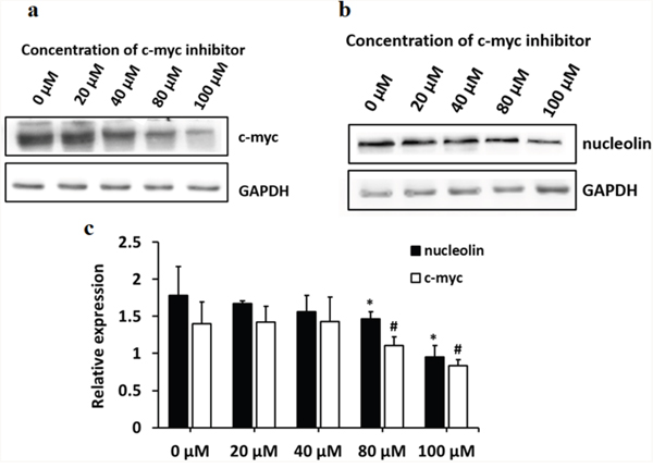Figure 2: c-myc controls the expression of nucleolin in L-02 cells. L-02 cells were treated with different concentrations of 10058-F4, a c-myc inhibitor. (a) c-myc protein band; (b) nucleolin protein band; (c) both c-myc and nucleolin expression were significantly decreased in cells treated with c-myc inhibitor concentrations of 80 μM and 100 μM (#: P < 0.05, relative expression of c-myc, compared with 0 μM; (*: P < 0.05, relative expression of nucleolin, compared with 0 μM).
