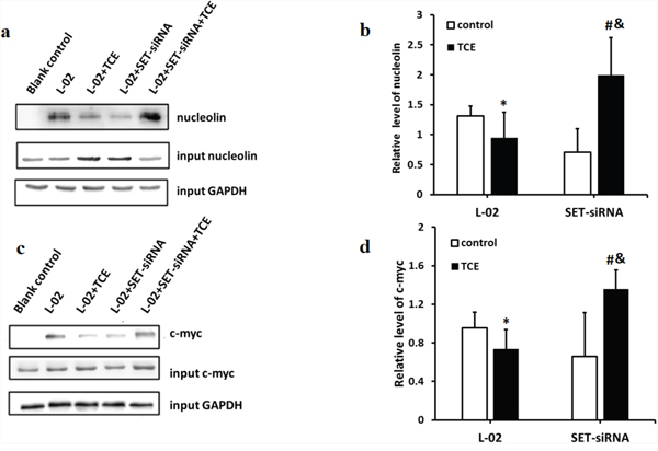 Figure 3: Dephosphorylation impairs the ability of nucleolin to bind to c-myc. (a) c-myc protein band eluted from immobilized nucleolin; (b) the ability of c-myc to capture nucleolin was impaired in TCE-treated L-02 liver cells, but improved however after SET knockdown (*: P < 0.05, compared with control; &: P < 0.05, compared with TCE-treated L-02 cells); (c) nucleolin protein band eluted from immobilized c-myc; (d) the ability of nucleolin to capture c-myc was impaired by TCE treatment in L-02 cells; this interaction improved after SET knockdown (*: P < 0.05, compared with control; &: P < 0.05, compared with TCE treated, L-02 control cells).