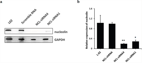 Figure 4: Stable knockdown of nucleolin in L-02 cells. (a) nucleolin protein band; (b) successful nucleolin knock down in L-02 cells by lentivirus-mediated RNA interference. The efficacy of NCL-siRNA4 was higher than that of NCL-siRNA1 (*: P < 0.05, compared with L-02 control cells; **: P < 0.01, compared with L-02 control cells).