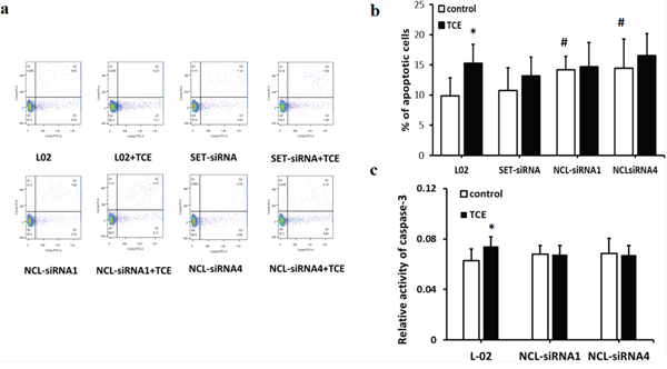 Figure 5: SET and nucleolin siRNAs attenuate TCE-induced apoptosis in human liver cells. (a) flow cytometry analysis of cell apoptosis by PI/Annexin-V staining; (b, c) TCE-induced apoptosis in L-02 cells was attenuated after SET knockdown and nucleolin knockdown (*: P < 0.05, compared with control,; #: P < 0.05, compared with L-02 cells); (c) caspase-3 activity assay indicates inhibition of apoptosis upon nucleolin knockdown in TCE-treated L-02 cells (P < 0.05).