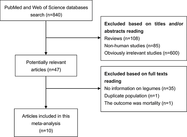 To reduce varieties between studies, we adopted the following methodological restrictions as the inclusion criteria: studies that provided the minimum information essential to calculate the relative risk (RR) associated with intake of legumes, including cohort and nested case-control studies published as original articles. In instances of duplicate publications, the most comprehensive information with the longest follow-up was used.