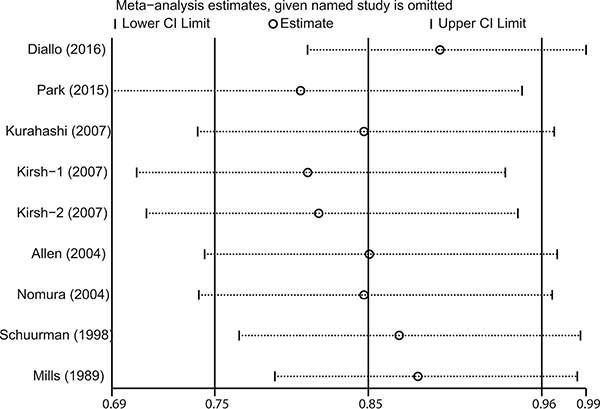 The influence of each included study on the pooled risk estimate was assessed by repeating the meta-analysis after omitting each study in turn. The results suggested that the combined RR was not dominated by any single study. The RRs ranged from a low of 0.81 (95% CI 0.69–0.95) to a high of 0.90 (95% CI 0.81–0.99) via omission of the study by Park et al. [17] and the study by Diallo et al. [9], respectively (Figure 3).