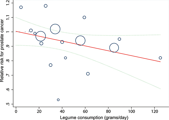 Figure 4: Linear dose-response relationship between relative risk (RR) of prostate cancer and legume consumption. Solid line represents the estimated RRs and the dotted lines represent the 95% confidence intervals (CIs). Circles present the dose-specific RRs reported in each study. The area of each circle is proportional to the inverse variance of the RR.