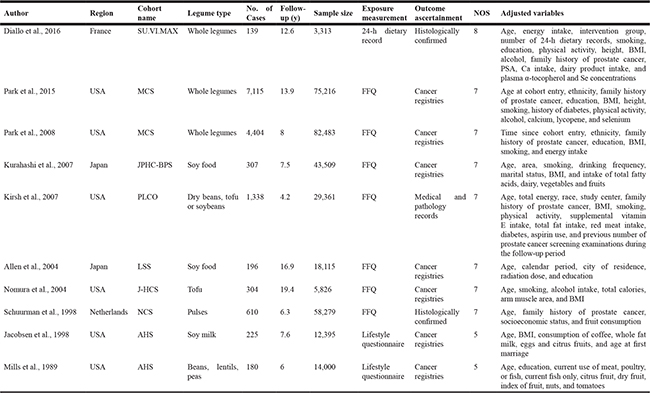 Of all the articles, six investigated the whole legume foods, two studied total soy foods, one investigated tofu, and one focused on soy milk. The ascertainment of prostate cancer based on cancer registries (seven studies), histologically examination (two studies), or medical and pathology records (one studies) (Table 1).