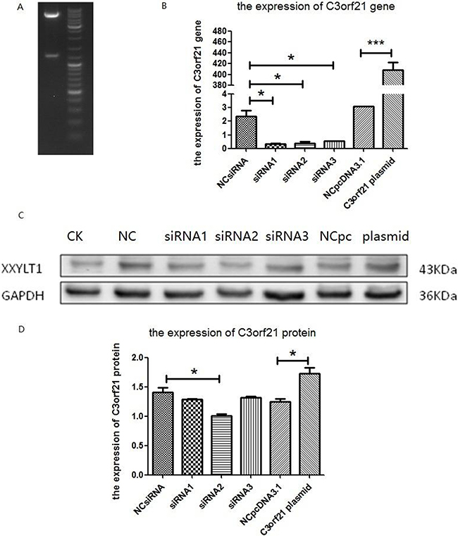 Figure 1: Confirmation of C3orf21 gene expression manipulation. (Panel A) C3orf21 plasmid digested with HindIII and BamH1 restriction enzymes. (Panel B) the fluorescence quantitative PCR-based expression of the C3orf21 gene in MSTO-211H cells after its ablation with three siRNAs or overexpression. NC siRNA indicated that MSTO-211H cells were transfected with control siRNA; siRNA1, siRNA2 and siRNA3 indicated that MSTO-211H cells were transfected with three C3orf21 gene-specific siRNAs; NCpcDNA3.1 represented cells transfected with the control vector; and C3orf21 plasmid represented MSTO-211H cells overexpressing C3orf21 gene cDNA. * indicates a P value of < 0.05, while *** represents a P value of < 0.001. (Panel C) indicates the C3orf21 gene expression by western blotting. (Panel D) represents the normalized quantification of C3orf21 protein expression in different cell types. * indicates a P value of < 0.05.