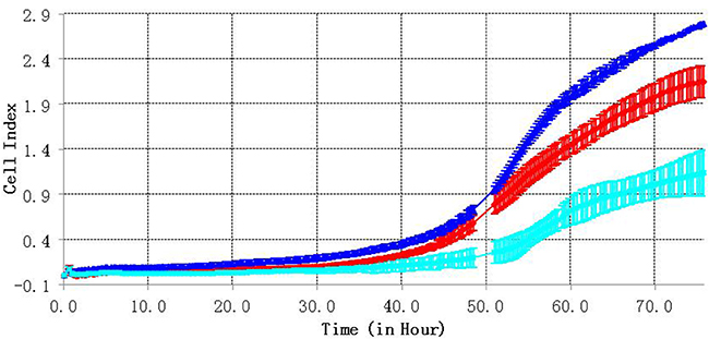 To assess the cell migration of MSTO-211H cells, we performed a real time cell analysis. First, 165 μl serum containing culture medium was added to the lower chamber of the cell invasion and migration (CIM) plate, while 30 ul of serum-free medium was added to the upper chamber, and the plate was incubated at 37°C and 5% CO2 for 1 hr to balance the baseline. Next, 100 μl of the logarithmic phase cells (concentration 4 × 105 per ml) in serum-free medium were added into the CIM upper chamber, and the cell migration was detected every 15 min. The real-time cell migration data were collected for 72 hrs.