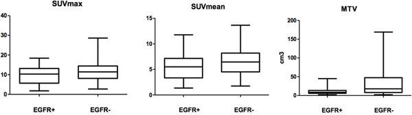 Our sample size (n=87) was comparable to previous similar studies, which have ranged from 77 to 106 in size. Furthermore, clinicopathological variables, such as sex, tumor histology, smoking history, and tumor location, were explored in our study, and a peripheral location and smoking history were found to be associated with EGFR mutation. These factors have varied in former studies, which could be a result of evaluating different numbers of patients and patients from different countries. Our findings provide evidence that a low MTV is associated with EGFR mutation and that PET/CT-associated parameters have a role in the noninvasive prediction of EGFR gene mutation status.