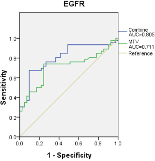 Noninvasive examination has been a focus of many recent studies, including our own. Determining how to utilize a patient’s clinicopathologic and imaging information to help identify EGFR mutation is worth studying. Measurements of metabolic parameters such as MTV and SUVmax offer an easy pathway towards this goal, as the majority of patients receive PET/CT during primary diagnosis and staging. Despite being readily available, however, the metabolic parameters that could help identify EGFR mutation have not been well researched to date. Based on the results in the current work, the sensitivity and specificity for our prediction model that included MTV were 61.0% and 80.4%, respectively.