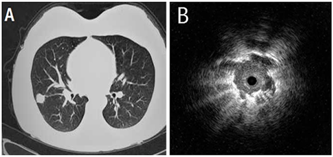Figure 1: A 52-year-old male who underwent right middle lung lobectomy for pulmonary adenocarcinoma. (A) Chest computed tomography showed a pulmonary nodule of 26 mm in diameter. (B) Endobronchial ultrasonography showed a low echoic nodule surrounded by a strong reflected interface produced between the aerated lung and the lesion.