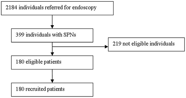 The study was designed to prospective evaluate the role of EBUS-GS-TBB in the evaluation of patients with SPNs. From January 2014 to August 2016, 2,184 consecutive unselected patients with suspected lung cancer were referred to Endoscopic Center of Nanjing Chest Hospital for diagnostic bronchoscopy. Patients with peripheral lung lesions were investigated by means of chest computed tomographs (CT). We screened 399 patients with SPNs, 219 patients were ineligible because they did not satisfy the inclusion criteria (Figure 2). One hundred and eighty patients with 180 SPNs ≤30 mm in mean diameter were enrolled for this study. SPNs were defined as those that were surrounded by pulmonary parenchyma and not visible by bronchoscopy.