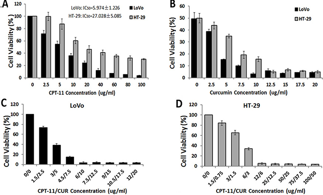 Figure 1: Effects of curcumin (CUR) and/or irinotecan (CPT-11) on cell viability in human CRC cell lines. (A) The effects of irinotecan on cell viability in human CRC cells. LoVo cells or HT-29 cells were treated with irinotecan at different concentration ranges as indicated for 24 h, and then cell viability was determined by CCK-8 assay. (B) The effects of curcumin with irinotecan at IC50 concentration on cell viability in human CRC cells. LoVo cells or HT-29 cells were co-treated with irinotecan at IC50 concentration and curcumin at different concentration ranges as indicated for 24 h to determine the optimal ratios of the combination treatment. LoVo cells (C) or HT-29 (D) cells were treated with different concentrations of curcumin and irinotecan with the optimal ratios for 24 h to determine the optimal dose for the combination treatment (LoVo: irinotecan:6 μg/ml and curcumin: 10 μg/ml; HT-29: irinotecan: 12 μg/ml and curcumin: 6 μg/ml). Values are means ± SEM.