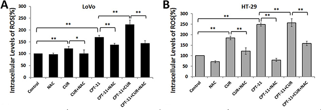 Figure 3: Effects of curcumin and/or irinotecan on ROS generation in human CRC cell lines. After pre-treatment with 5 mM NAC for 2 h, LoVo cells (A) or HT-29 cells (B) were treated with curcumin and/or irinotecan at the optimal dose concentrations for 24 h, and cellular ROS levels were measured with 10 μM DCFH-DA using a fluorescence microplate reader. Values are means ± SEM. *< 0.05; **< 0.01.