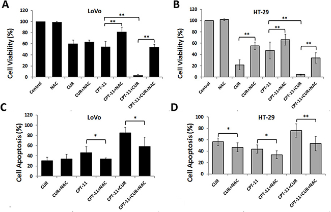 Oxidative stress plays an important role in controlling cancer cell behavior, and high levels of ROS increase cancer cell apoptosis [14, 15]. We examined whether increased ROS was required for reduced cell viability and increased apoptosis of LoVo and HT-29 cells with curcumin and/or irinotecan treatment. The growth inhibitory effects of individual and combination treatments were all blocked by NAC pretreatment (Figure 4A and 4B). As shown in Figure 4Cand 4D, NAC also blocked the cell apoptosis induced by curcumin and/or irinotecan. These results demonstrated that cell growth inhibition and apoptosis induced by combination treatment might partly depend on ROS production.