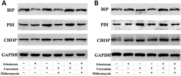 Figure 5: Effects of ER stress inhibitors on ER stress induced by curcumin and/or irinotecan in human CRC cell lines. After pretreatment with 0.1 μM mithramycin (MTM) for 30 min, LoVo cells (A) or HT-29 cells (B) were treated with curcumin and/or irinotecan at the optimal dose concentrations for 24 h, and expression of BIP, PDI, and CHOP were assessed by western blotting.