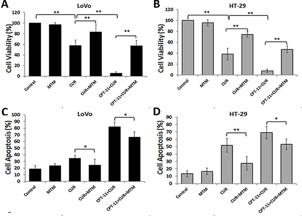 Figure 6: ER Stress is mediates the anti-colorectal cancer effects of curcumin alone or combined with irinotecan. (A, B) The effects of an ER stress inhibitor on cell growth inhibition induced by curcumin alone or with irinotecan. After pretreatment with 0.1 μM mithramycin (MTM) for 30 min, LoVo cells (A) or HT-29 cells (B) were treated with curcumin alone or with irinotecan for 24 h, then cell viability was assessed by CCK-8 assay. (C, D) The effects of an ER stress inhibitor on apoptosis induced by curcumin alone or with irinotecan. After cells were treated as described above, cell apoptosis was measured by Annexin V-FITC/PI staining. Values are means ± SEM. *< 0.05; **< 0.01.