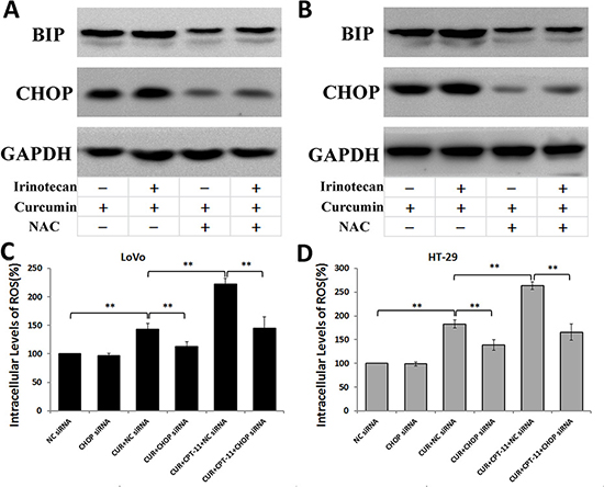 Oxidative stress activates ER stress-related apoptosis [10, 11]. To determine whether ROS generation is required for ER stress induced by curcumin alone or combined with irinotecan, we first used the ROS scavenger NAC to block ROS generation, and then examined expression of ER stress protein markers. As shown in Figure 8, pretreatment with NAC inhibited the expression of ER stress markers BIP and CHOP that was induced by curcumin alone or combined with irinotecan in LoVo cells (Figure 8A) and HT-29 cells (Figure 8B). To determine whether ER stress was involved in regulating ROS generation, we silenced CHOP gene expression using siRNA and measured intracellular ROS levels in LoVo and HT-29 cells treated with curcumin alone or combined with irinotecan. Blocking CHOP expression with siRNA decreased the level of ROS production induced by curcumin alone or combined with irinotecan treatment in CRC cells (Figure 8C and 8D). These results suggested that blocking ER stress suppresses ROS production induced by curcumin alone or combined with irinotecan, and that ROS generation might be promoted by severe ER stress in CRC cells.