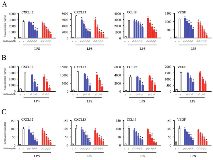 Figure 1: Btk inhibition suppresses production of homeostatic chemokines and angiogenic cytokines by macrophages. (A) THP-1 differentiated macrophages (2.5 × 105) were pretreated with indicated concentration of Btk inhibitors (0.2, 0.5, 1, 2, 5 μM) for 1 hour. (B) PBMCs (1 × 106) were pretreated with indicated concentration of Btk inhibitors (0.2, 1, 5 μM) for 1 hour. After Btk inhibitor washout, the cells were stimulated with LPS (1 μg/ml) for 17 hours and the culture supernatant was harvested for the analysis of the chemokines and cytokine production. (C) Total RNA was extracted, and the expression of mRNA was detected by real time PCR. *Significantly decreased compared to LPS treatment alone (p < 0.05). Results are representative of three similar experiments.