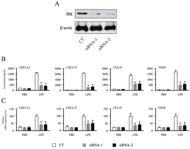 Figure 2: Depletion of Btk inhibits macrophage production of homeostatic chemokines and angiogenic cytokines. (A & B) THP-1 differentiated macrophages were transfected with Btk siRNA for 48 hours and then stimulated with LPS (1 μg/ml) for 18 hours. The chemokine and cytokine production from macrophages were measured by ELISA. (C) Total RNA was extracted, and the expression of mRNA was detected by real time PCR. *Significantly decreased compared to LPS treatment alone (p < 0.05). Results are representative of three similar experiments.