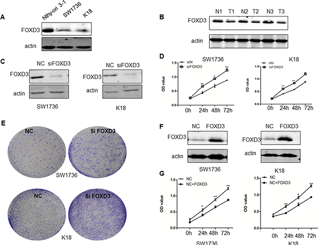 Figure 1: FOXD3 promotes anaplastic thyroid cancer cell growth and proliferation. (A) FOXD3 levels in the normal thyroid cell line, Nthy-ori 3-1 and ATC cell lines, SW1736 and K18 were compared by western blot. (B) Immunoblot analysis of FOXD3 in normal thyroid and anaplastic thyroid tumor samples (C) The control and siFOXD3 transfected SW1736 and K18 cells were cultured for 72 h and the FOXD3 protein levels were determined by western blot. (D) Cell proliferation of control and siFOXD3 transfected SW1736 and K18 cells was determined at 24, 48 and 72 h by MTT cell viability assay. (E) Colony formation ability of control and siFOXD3 transfected SW1736 and K18 cells was determined by soft-agar colony assay. (F) The FOXD3 levels in control and FOXD3 overexpression vector transfected SW1736 and K18 cells was determined by western blotting. (G) Cell proliferation of control and FOXD3 overexpression vector transfected SW1736 and K18 cells was determined by MTT assays. *p < 0.05, **p < 0.01. Data are represented as mean ± SEM from three independent experiments.