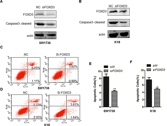 Figure 2: FOXD3 knockdown inhibits cell apoptosis of ATC cell lines. (A–B) Western blot analysis of cleaved caspase-3 in control (scrambled siRNA) and FOXD3 siRNA transfected SW1736 and K18 cells. (C–D) Flow cytometry analysis of apoptosis in control (scrambled siRNA) and FOXD3 siRNA transfected SW1736 and K18 cells, respectively, based on AnnexinV-FITC/Propidium iodide double staining assay. (E–F) Quantification of apoptotic cells (AnnexinV+ PI+) in control (scrambled siRNA) and FOXD3 siRNA transfected SW1736 and K18 cells.