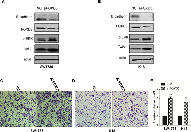 We further tested if FOXD3 expression was associated with epithelial-mesenchymal transition (EMT) and metastasis. First, we analyzed expression of TWIST1, E-cadherin and p-ERK that are involved in EMT and metastasis of breast cancer [13]. We observed that FOXD3 knockdown increased Twist1 and p-ERK levels, but, E-cadherin remained constant and was not downregulated (Figure 3A–3B). In addition, knockdown of FOXD3 enhanced invasiveness of SW1736 and K18 cells in the Transwell migration assay (Figure 3C–3E). This suggested that low FOXD3 enhanced EMT and metastasis of anaplastic thyroid cancer cells.
