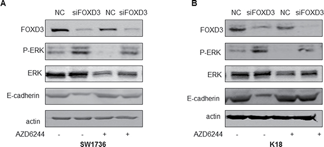 Figure 4: FOXD3 regulates MAPK/ERK signaling and EMT in ATC cell lines. (A–B) Western blot analysis of p-ERK and FOXD3 in siFOXD3 transfected SW1736 and K18 cells treated with or without MEK inhibitor (AZD6244) is shown.