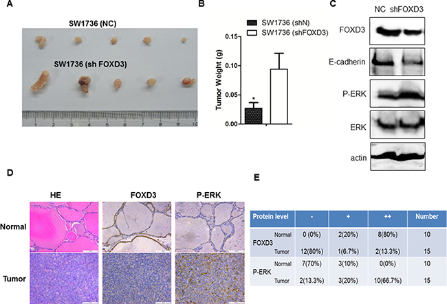 Next, we performed murine xenograft experiments with FOXD3 knockdown and control SW1736 cells to understand the in vivo relevance of FOXD3 in anaplastic thyroid tumor growth. We observed that tumors derived from FOXD3 knockdown SW1736 cells were larger than those from control SW1736 cells. This was further reflected by concomitant increase in tumor weight from FOXD3 knockdown SW1736 cells compared to controls (Figure 5A, 5B). Furthermore, reduced FOXD3 protein expression in the knockdown tumor samples was also associated with low E-cadherin and high p-ERK1/2 levels compared with the controls (Figure 5C). Immunohistochemical analysis further revealed low FOXD3 and high p-ERK1/2 expression in human anaplastic thyroid tumors compared to normal tissue samples (Figure 5D–5E), thereby confirming the association between FOXD3 and MAPK/ERK signaling.