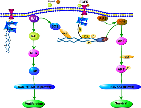 In the progression of NSCLC, EGFR, regarded as the cancer driver gene [30, 31], demonstrates the effects of numerous oncogenic, including stimulating DNA synthesis, cell cycle, cell proliferation, cell metastasis and invasion [32, 33], and has been proposed as an attractive and promising target for anti-cancer treatment [34]. The expression of high level of EGFR, the pathway can also be up-regulated by coexpression of receptor ligands (such as transforming growth factor-α (TGF-α) or EGF). Moreover, the duration of the EGFR signaling pathways are stimulated by the positive feedback loop formed by EGFR, a ligand-releasing protease and the RAS-MAPK signaling pathway (Figure 1). As the signaling response can be prolonged in a cell that is efficient in recapturing the endogenous ligand, in spite of the levels of EGFR expressed may be low [35]. Furthermore, a research in breast cancer verified that co-expression of TGF-α and EGFR had a more remarkable effect on survival, comparing to the co-expression of HER-2 and EGFR [36]. In lung cancer, one study has reported that synchronous expression of EGFR and HER-2 is predictive of increased recurrence risk. Moreover, the success therapy with programmed death ligand 1 (PD-L1) blockade in lung cancer suggests that immune escape mechanisms can be conducive to lung tumor etiopathogenesis [37].