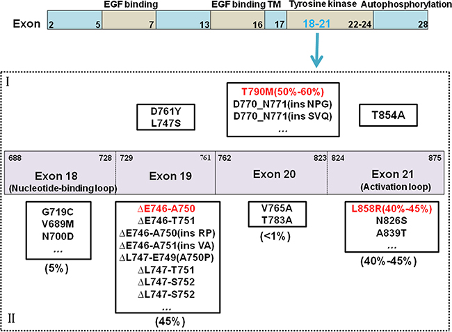Figure 2: EGFR mutations and drug-resistant mechanism. As common mutant sites, the mutations of exon18-21 in EGFR are discovered. It’s including common mutations and rare mutations. Common mutations are involved deletion mutations in 45 percent of 19 exon, and point mutations of L858R in 40–45 percent of 21 exon. Others are rare mutations. The reason to raise drug-resistant is that it arises new mutations, the most important mutations is T790M in 50 percent. I stands for Mutations associated with drug resistant, II stands for Mutations associated with drug sensitivity.