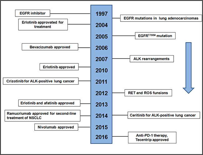The discovery of EGFR mutations and ALK-rearrangements were the first molecular alterations in lung adenocarcinoma that confer sensitivity to TKIs in 2004 and 2007 (Figure 3), heralding the initiation of the era of precision medicine for lung [15, 47]. Among EGFR mutations, EGFRT790M mutation was a clear target for drug development to address the important precision medicine need, which identified as a mechanism of resistance to TKIs (Figure 3). The remarkable responses to TKIs observed in patients as well as the discoveries made studying these molecular subsets of lung cancer, served as catalysts for further exploration of the lung cancer genome, leading to the incorporation of molecular testing in routine clinical practice. Clinical trials have revealed that treatment of advanced EGFR lung cancers is superior to chemotherapy, using the appropriate TKIs [19, 48]. Conversely, it has also been shown that patients with the mutant EGFR lung cancers rarely respond to EGFR TKIs and are more likely to benefit from chemotherapy, underlining the importance of matching tumor genotype to therapy [48]. Here, we show the timeline of the history of EGFR development in recent years (Figure 3). At present and future efforts to find new types of precision medicine for lung cancers is necessary to improve outcomes for patients with lung cancer, as well as biomarker-driven clinical trials. In lung cancer, the impact of precision medicine has resulted in considerable changes as well as challenges in diagnostic pathology [49].
