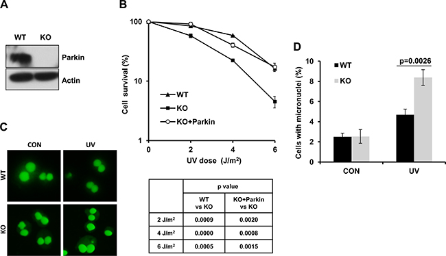 Figure 1: Parkin-null cells are hypersensitive to UV radiation. (A) Expression of Parkin in WT and Parkin−/− cells were examined by western-blot with an anti-Parkin antibody. β-actin: loading control. (B) Viability of cells after exposure to UV radiation. WT, Parkin−/−, and Parkin−/− cells complemented with Parkin were irradiated with the indicated doses of UV, and further incubated in complete medium for 10 days, then cell colonies were determined. Cell viability was expressed as a percentage of mock-treated cells. Error bars represent SD, t-test, n = 3. (C–D) WT and Parkin−/− cells were irradiated with 2 J/m2 UV, and further incubated in complete medium containing 6 μg/ml CB for 48 h. Then percentage of cells with micronuclei was determined. (C) Representative images of control and UV-irradiated WT and Parkin−/− cells in micronucleus test. (D) Quantification of the percentage of cells with micronuclei. Error bars represent SD. t-test, n = 3.
