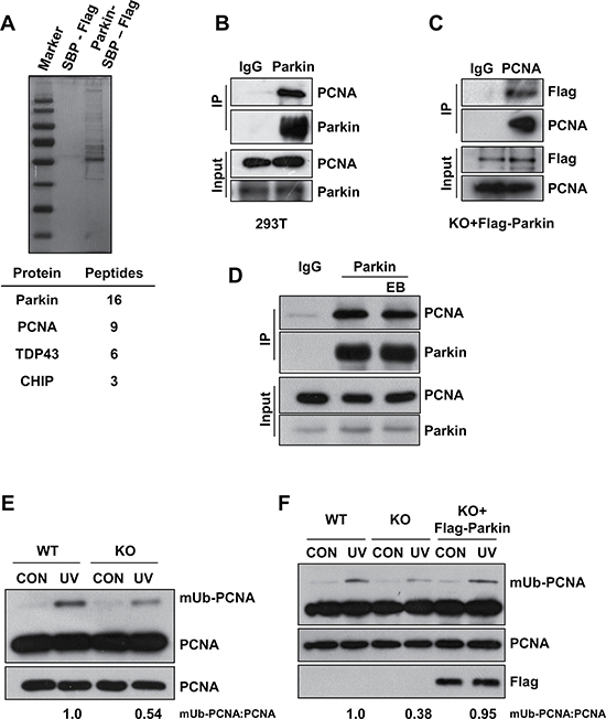 Figure 2: Parkin promotes PCNA monoubiquitination after exposure to UV radiation. (A) HEK293T cells ectopically expressing empty vector or Parkin-SBP-Flag were used for tandem affinity purification as described in “Materials and Methods”. The final eluates were resolved by SDS-PAGE and revealed by silver staining. Representative proteins identified by mass spectrum were shown below. (B) HEK293T cells were lysed and incubated with protein A/G agarose conjugated with normal rabbit IgG or anti-Parkin antibody, the immunoprecipitates were then examined via western blot with antibodies against PCNA and Parkin. (C) Parkin−/− cells stably expressing Flag-Parkin were lysed and incubated with protein A/G agarose conjugated with normal mouse IgG or anti-PCNA antibody, the immunoprecipitates were then examined via western blot with antibodies against PCNA and Flag. (D) HEK293T cells were lysed and incubated with protein A/G agarose conjugated with normal rabbit IgG or anti-Parkin antibody for immunoprecipitation in the presence of EB or not, followed by blotting with the indicated antibodies. (E) WT and Parkin−/− cells were irradiated with 15 J/m2 UV and collected 3 h later. The levels of mUb-PCNA were examined by western blot with an anti-PCNA antibody. (F) WT, Parkin−/−, and Parkin−/− cells complemented with Flag-Parkin were treated and examined as in (E).