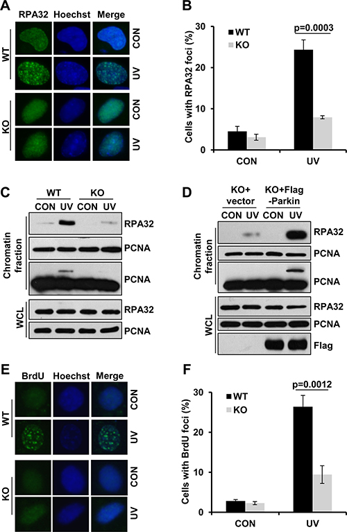 RPA is known to be recruited to stalled replication forks through its avid affinity with ssDNA. We then determined whether Parkin is required for ssDNA generation upon UV radiation. WT and Parkin-null cells were incubated with 10 μM BrdU for 48 h to label genomic DNA before being irradiated with UV, followed by immunofluorescence with an anti-BrdU antibody without denaturation of DNA. Intriguingly, at 2 h post-UV, Parkin-null cells exhibited considerable decrease in the percentage of BrdU-positive cells comparing with WT cells (Figure 4E–4F), indicating that Parkin facilitates efficient ssDNA generation after exposure to UV.