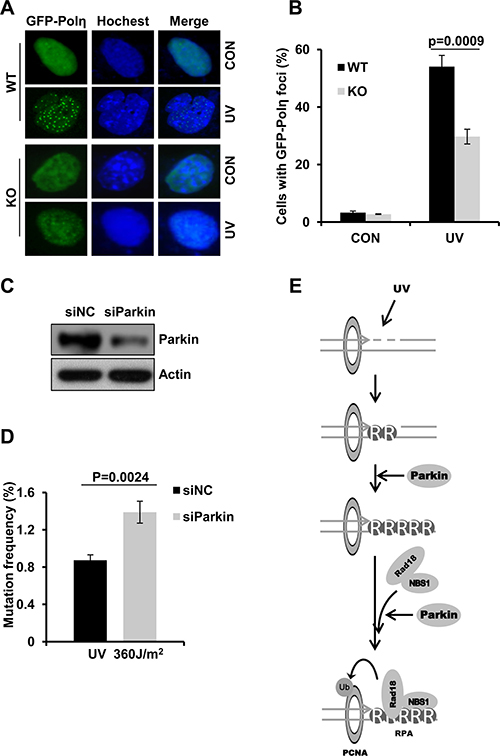 Figure 6: Parkin deficiency attenuates Polη recruitment to damage sites and leads to higher mutation frequency. (A–B) Parkin deficiency was detrimental for recruitment of Polη to UV-induced damage sites. WT or Parkin−/− cells transfected with GFP-Polη were irradiated with 15 J/m2 UV and further incubated for 8 h. Then cells were fixed and the proportion of cells with GFP-Polη foci was determined. (A) Representative images of Polη foci formation in WT and Parkin−/− cells. (B) Quantification of the percentage of cells with more than 30 GFP-Polη foci. Error bars represent SD. t-test, n = 3. (C–D) Parkin deficiency led to higher mutation frequency. (C) 293T cells were transfected with siParkin or siNC. 72 h later, the cells were harvested and the levels of Parkin were detected by western blot. β-actin: loading control. (D) The Parkin-depleted 293T cells were transfected with pSP189 plasmid which was pre-irradiated with 360 J/m2 UV, and replicated for 72 h. The pSP189 plasmid was then extracted and DpnI digested followed by transformation into MBM7070 bacteria strain for mutation frequency analysis. Error bars represent SD. t-test, n = 3. (E) Model for Parkin’s function in regulating TLS.